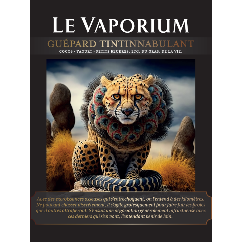 Le Guépard Tintinnabulant est un e-liquide imaginé, façonné par le Vaporium et fabriqué par le laboratoire Toutatis situé en Nouvelle-Aquitaine.