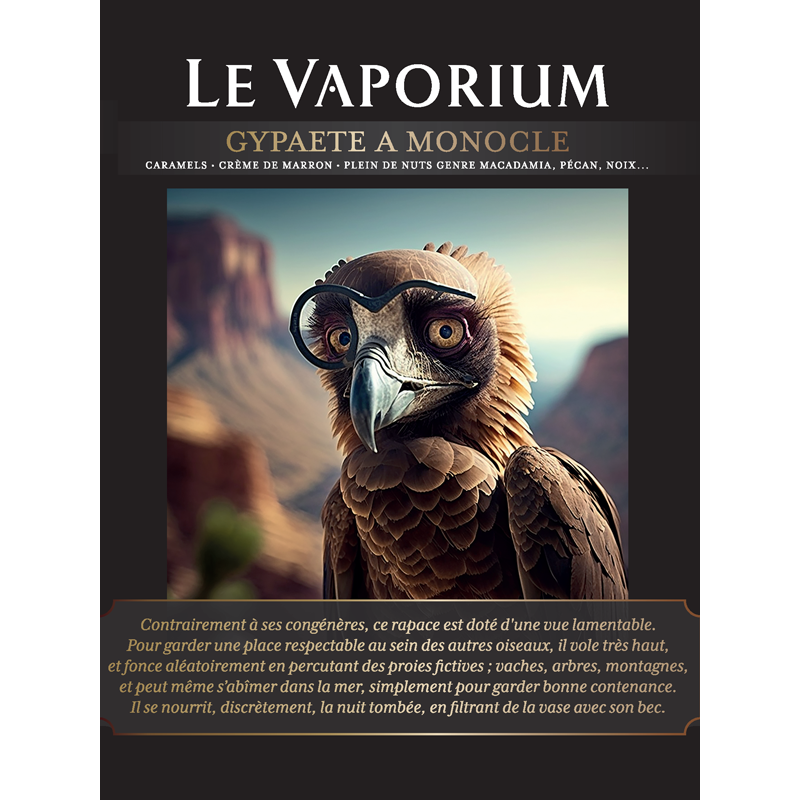 Le Gypaète à Monocle est un e-liquide imaginé, façonné par le Vaporium et fabriqué par le laboratoire Toutatis situé en Nouvelle-Aquitaine.
