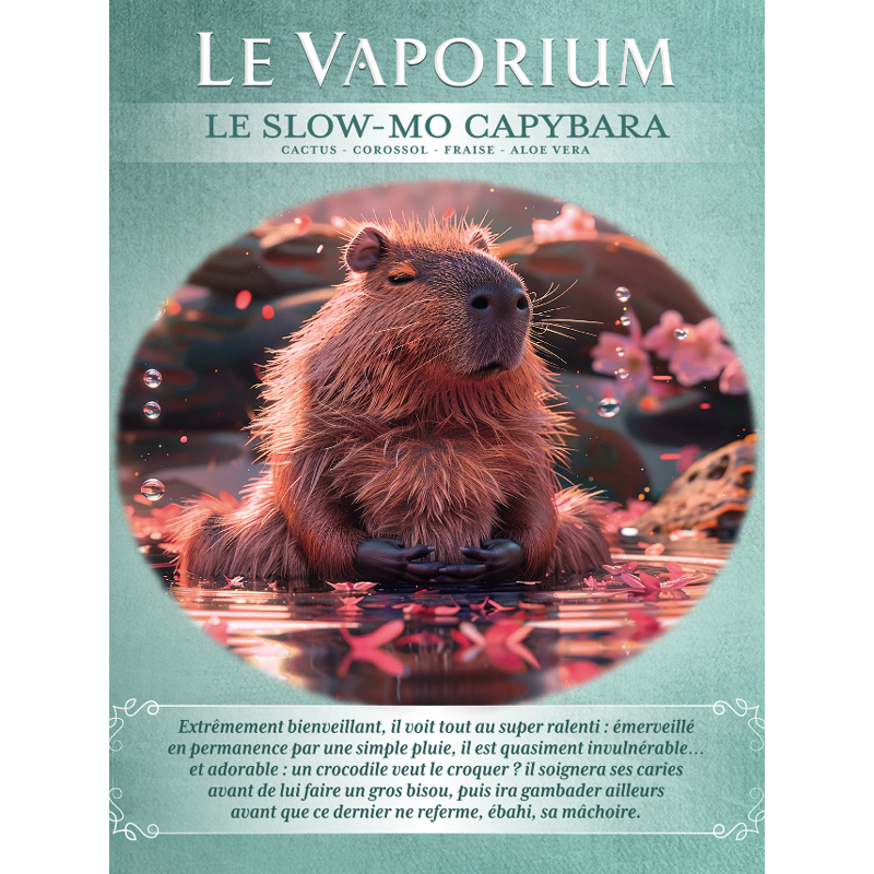 Le Slow-mo Capybara est un e-liquide imaginé, façonné par le Vaporium fabriqué par le laboratoire TOUTATIS situé en Nouvelle-Aquitaine.